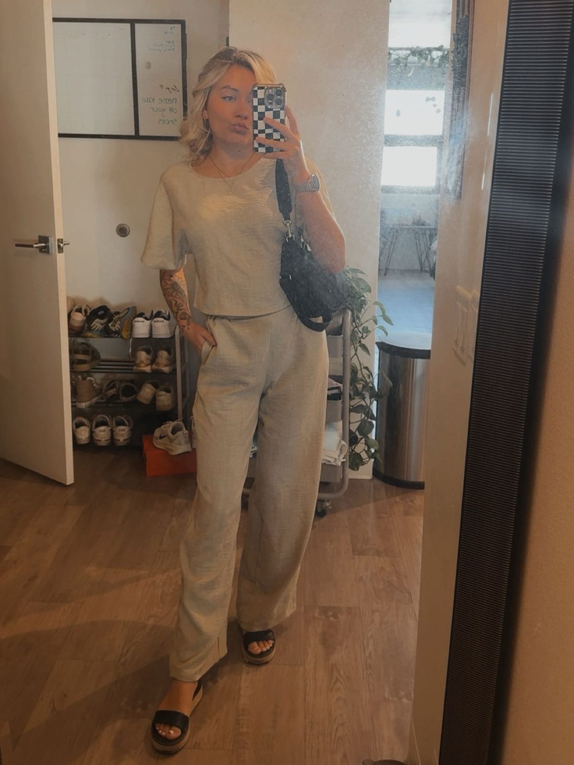 Outfit idea: Matching lounge set, cream puffer vest, and mules.